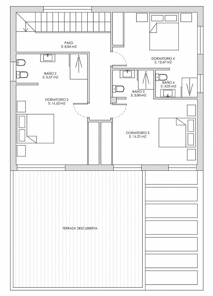 First floor, 125 square meter, has three bedrooms with bathrooms ensuite. Two of the bedrooms have access to a south facing terrace.