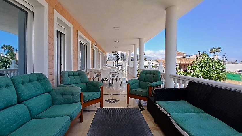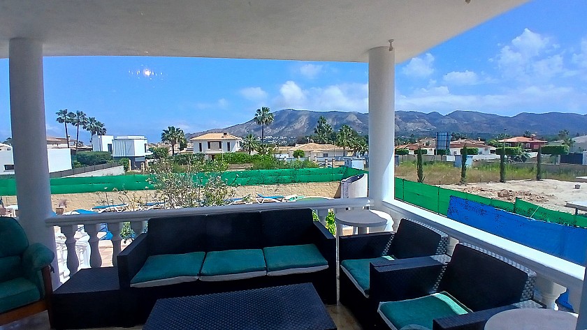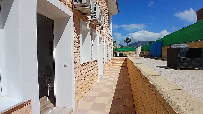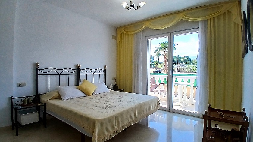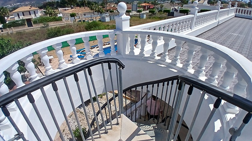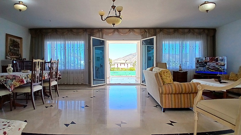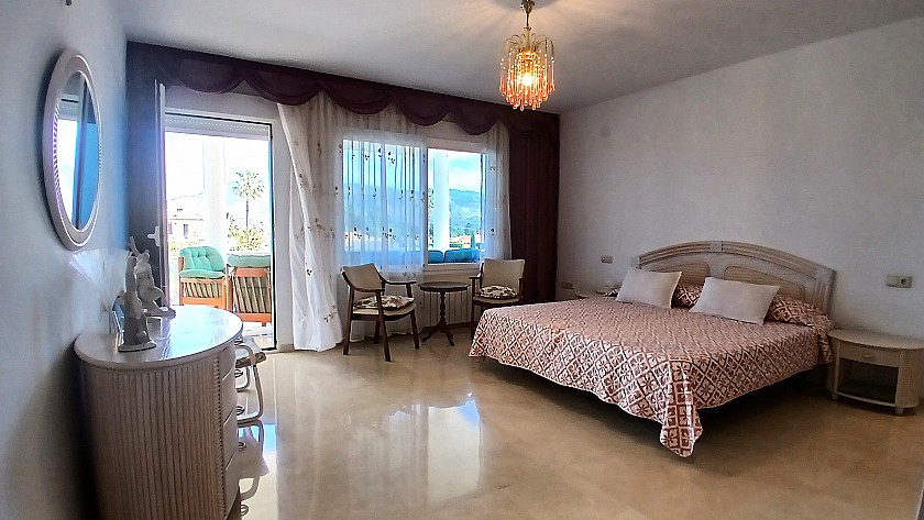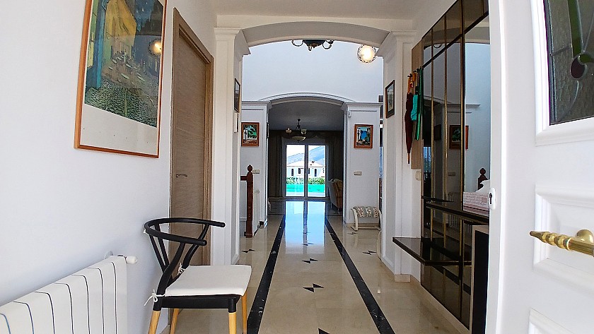 Kitchen, living room and the large master bedroom all have direct access to the 60 m2 covered terrace, from where you have panoramic view to mountains and the landscape. A wide staircase goes down to the garden and pool terrace.