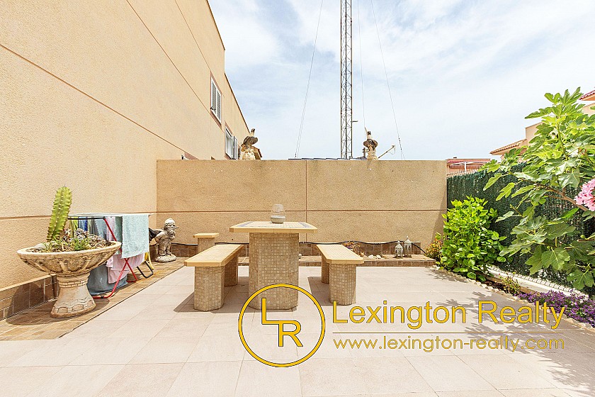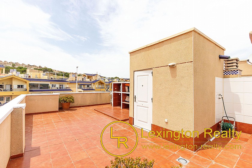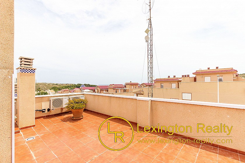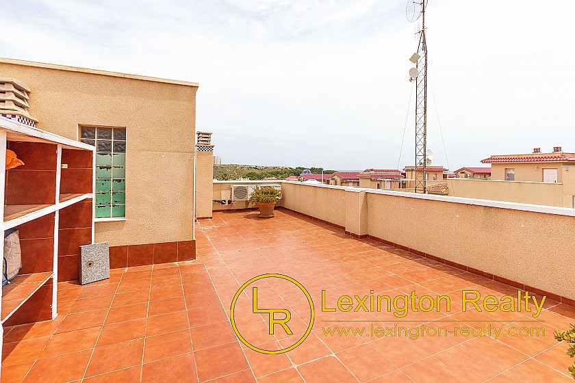 Lexington Realty is happy to announce this corner townhouse for sale. in Novamar 5. This is a large townhouse with 3 bedrooms and a bathroom at the first floor. On the main floor you enter into a small hall with a bathroom, from there to the ample lounge and the kitchen and the utility room you find at the end. On the top floor there is a large roof terrace with shower and not at least views to the sea.
