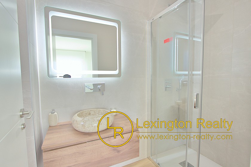 Inside, the villa is designed for modern living, with fully equipped wardrobes in all bedrooms, TV and internet points in every room, and a fitted kitchen complete with integrated appliances (washing machine, fridge, dishwasher, extractor hood, ceramic hob, oven, and microwave). The bathrooms feature suspended sanitary ware, slate-effect showers, and glass screens.
